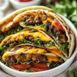 This isn’t just another recipe; it’s a passport to flavor town! These Grilled Cheeseburger Wraps are a guaranteed crowd-pleaser, offering a delightful twist on a classic comfort food. The combination of juicy, seasoned ground beef, melted cheese, and your favorite burger toppings, all nestled in a warm, grilled tortilla, is simply irresistible. Forget boring lunches or predictable dinners this recipe injects fun and flavor into every bite. Why is this a must-try? Because it’s incredibly versatile, quick to prepare, and utterly delicious. It’s perfect for busy weeknights when you need a satisfying meal on the table in under 30 minutes. It’s also a fantastic option for picnics, potlucks, or even a casual backyard barbecue. The portability of the wraps makes them ideal for on-the-go eating, and the customizable fillings mean everyone can create their perfect cheeseburger experience. But the real magic lies in the grilling. That slight char on the tortilla adds a smoky depth of flavor that elevates these wraps from ordinary to extraordinary. The grilling process also helps to melt the cheese to gooey perfection and seals in all the delicious juices, creating a truly unforgettable culinary experience. Looking for serving suggestions? The possibilities are endless! Serve these Grilled Cheeseburger Wraps with a side of crispy sweet potato fries, a refreshing coleslaw, or a simple green salad. For a spicier kick, add some jalapeños or a drizzle of sriracha mayo. Want to make them even more decadent? Try adding crispy bacon or caramelized onions. Here are a few variations to get your creative juices flowing: * Pizza Cheeseburger Wraps: Add pepperoni, marinara sauce, and mozzarella cheese for a pizza-inspired twist. * BBQ Cheeseburger Wraps: Use BBQ sauce instead of ketchup and add some pulled pork for a smoky, savory delight. * Veggie Cheeseburger Wraps: Substitute the ground beef with a plant-based burger patty and load up on your favorite veggies. * Spicy Southwest Cheeseburger Wraps: Add black beans, corn, salsa, and a sprinkle of chili powder for a Southwestern flair. * Breakfast Cheeseburger Wraps: Scramble some eggs and add them to the wrap along with bacon or sausage for a hearty breakfast option. Don’t be afraid to experiment and create your own signature Grilled Cheeseburger Wraps! The beauty of this recipe is that it’s incredibly adaptable to your personal preferences and dietary needs. I’m confident that you’ll love this recipe as much as I do. It’s a guaranteed crowd-pleaser that’s perfect for any occasion. So, what are you waiting for? Gather your ingredients, fire up the grill, and get ready to experience the ultimate cheeseburger wrap sensation! I’m so excited for you to try this recipe! Once you’ve made your own delicious Grilled Cheeseburger Wraps, please come back and share your experience in the comments below. I’d love to hear about your favorite toppings, variations, and any tips or tricks you discovered along the way. Let’s create a community of cheeseburger wrap enthusiasts! Happy grilling! Print